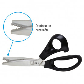 Tijera de precisión para festonear en zigzag. Hojas de acero inoxidable con mangos anatómicos fabricados en nylon de color negro.