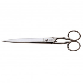 Tijera de hojas estrechas y largas. Fabricada en acero al carbono de altas prestaciones, con forja en caliente y acabado niquelado. Longitud total: 253 mm.