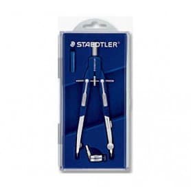 Compás de precisión con rueda central y mecanismo de ajuste rápido mediante teclas. Se presenta en estuche de plástico y tapa transparente con tubo de piezas de recambio y adaptador universal de rosca.