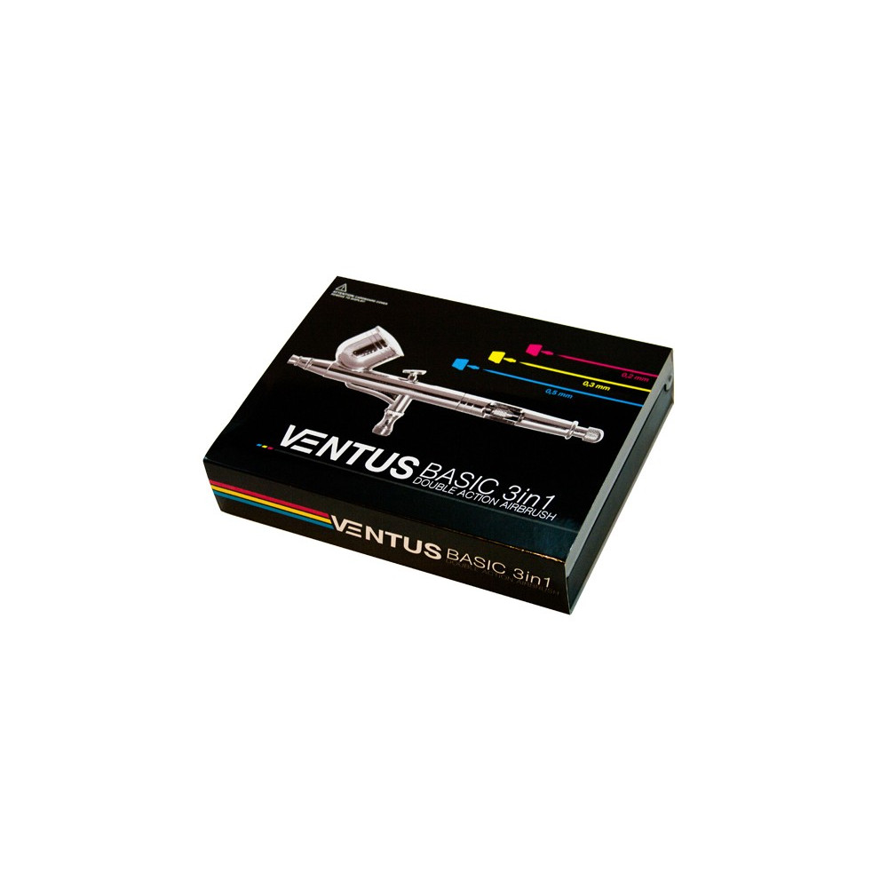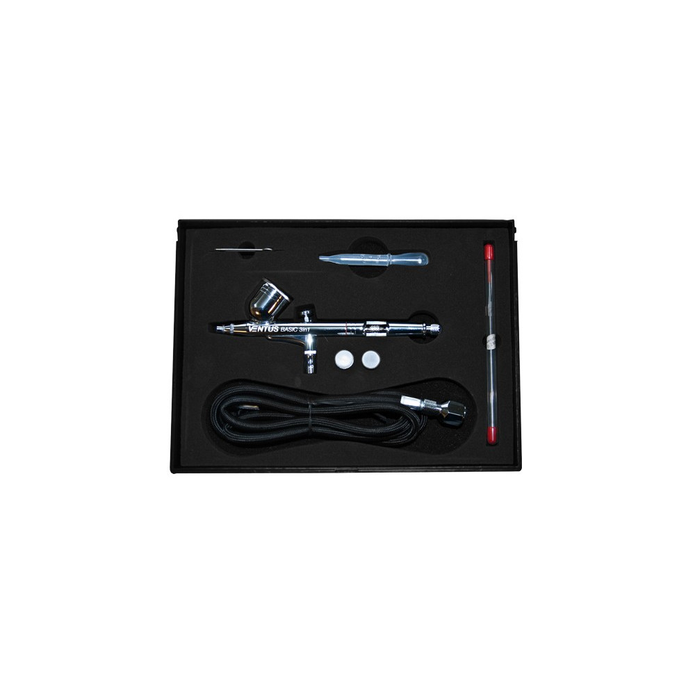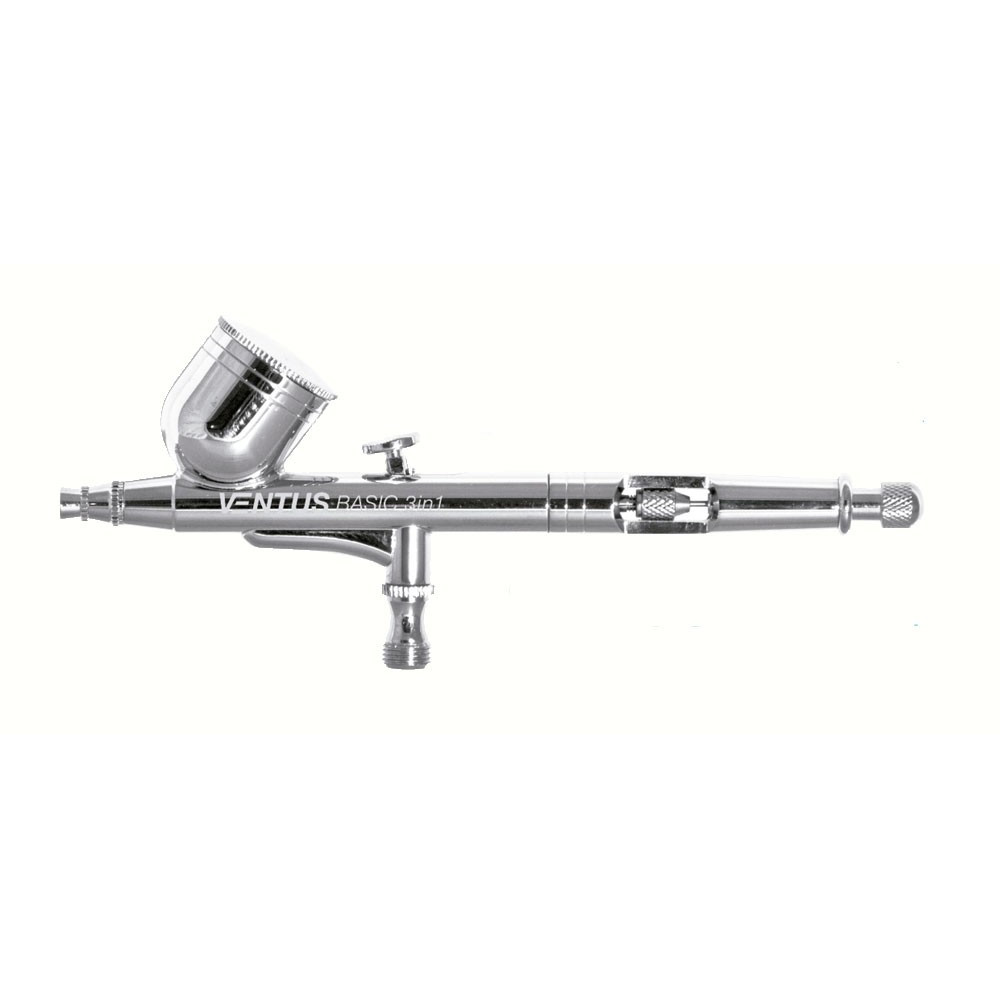 Aerógrafo de doble acción y alimentación por gravedad con 3 de boquillas y agujas de tres tamaños.