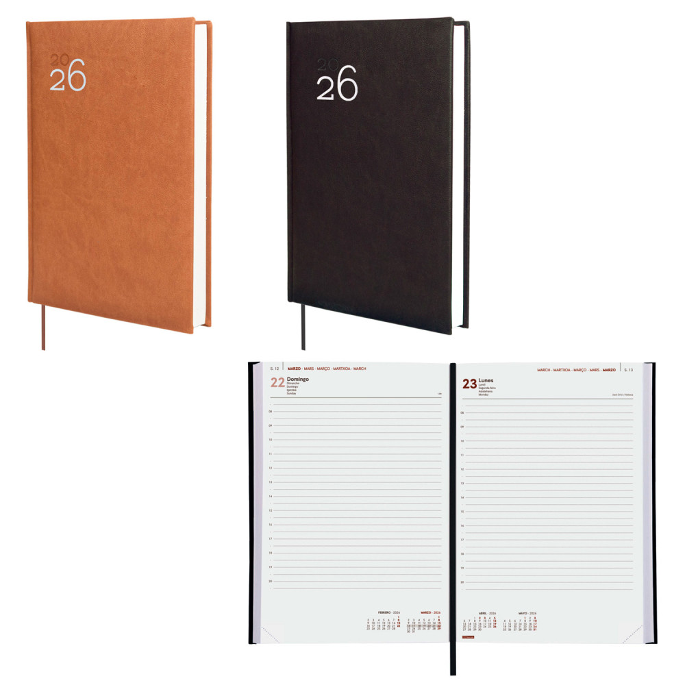 Distribución día por página. Apertura perfecta para una cómoda escritura. Clásica y elegante, con tapa dura acolchada de polipiel en colores opcionales. Formato profesional de sobremesa que permite guardar papeles DIN A5 o DIN A4 doblados sin que sobresalgan de la agenda.
