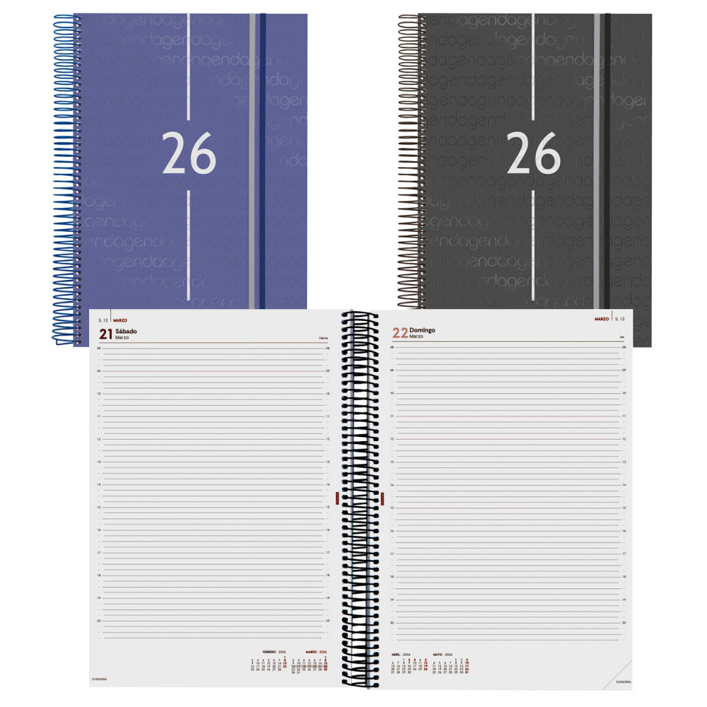 Agenda de espiral con tapas de polipropileno para uso profesional y/o privado. Con goma elástica.Gran formato, ideal para negocios: restaurantes, peluquerías, etc. Puntero inferior con la fecha para identificar rápidamente el día del mes. Con doble goma elástica: una sirve de punto, la otra cierra la agenda.