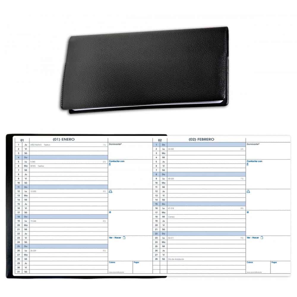 Agenda de año (de enero a diciembre) extraplana de bolsillo. Distribución mensual y apertura en acordeón. Tapas fabricadas en resistente plástico reciclado y grano de marroquinería imitando piel.