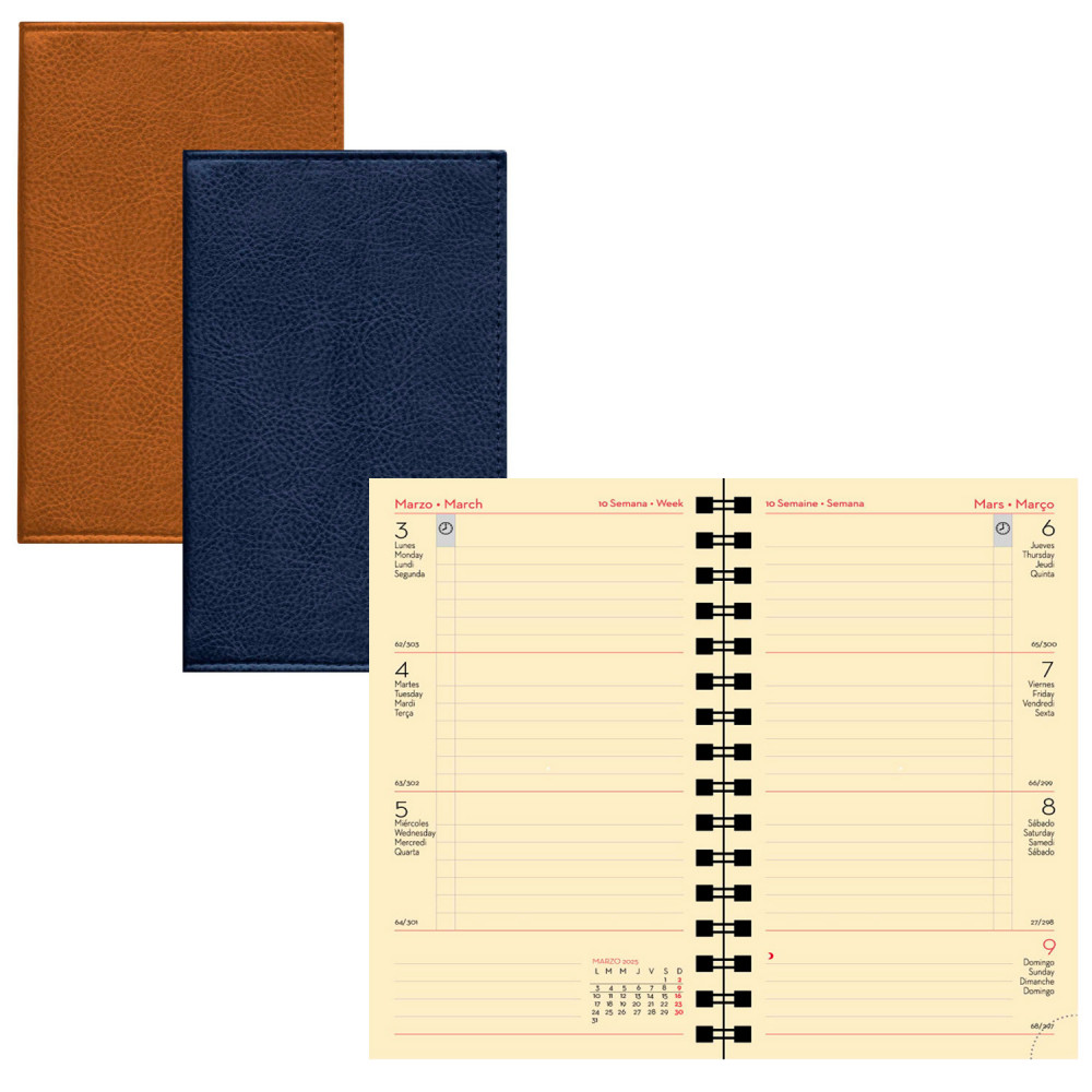 Agenda página por día con sábado y domingo en la misma página. Cubierta en símil piel color azul y mecanismo de anillas.