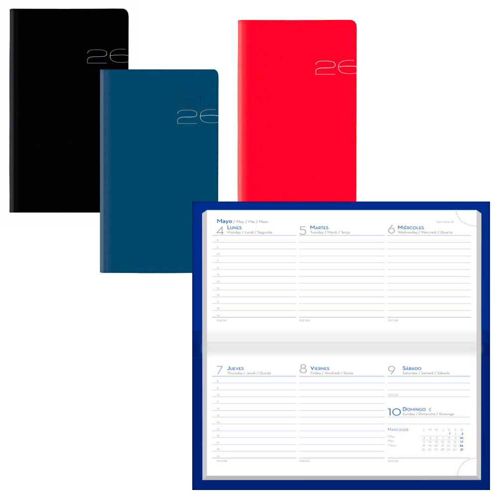 Agenda de bolsillo con distribución de la semana en doble página. Toda la semana de un vistazo. Colores opcionales: azul, negro y rojo.