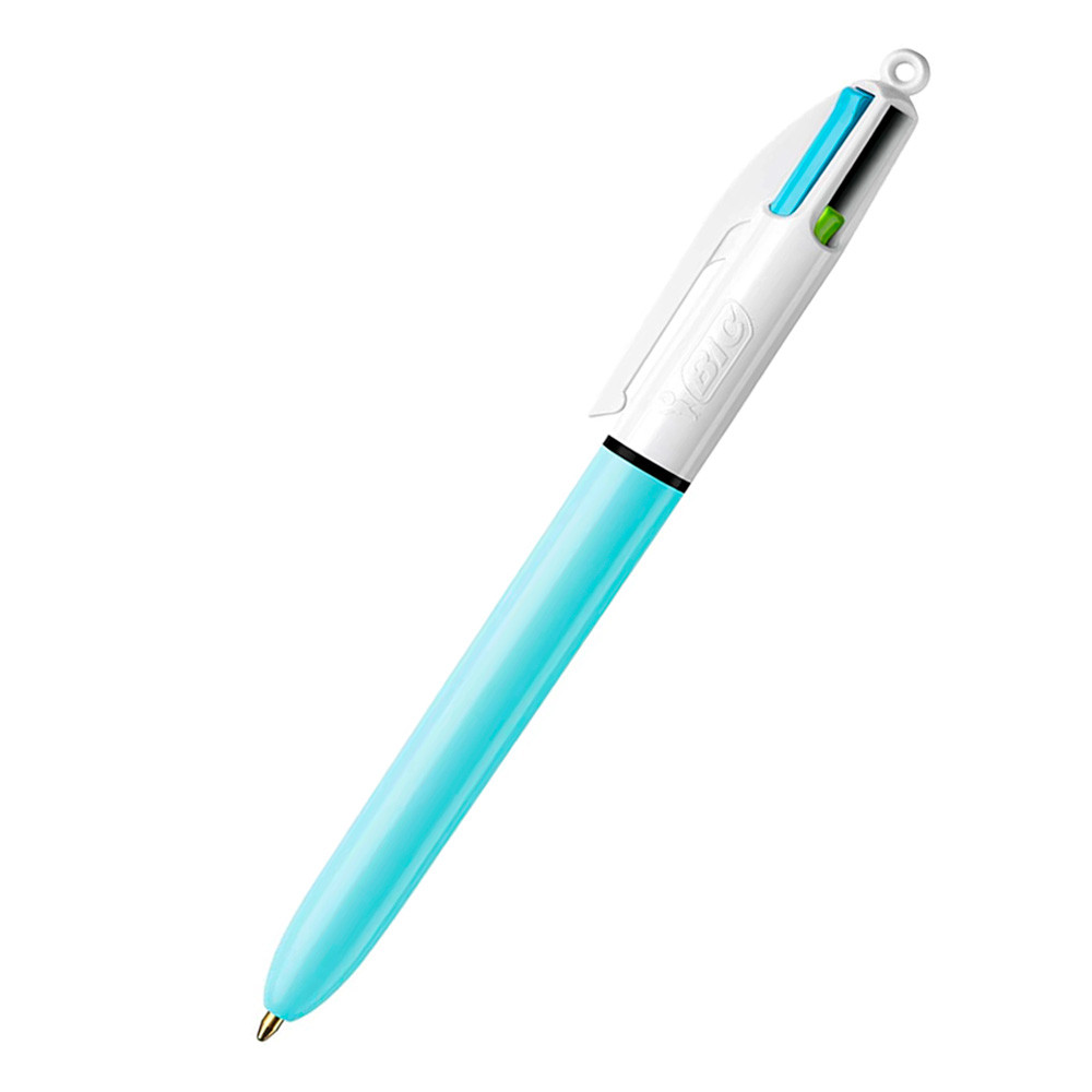Bolígrafo BIC cuatro colores. Punta de 1mm y tintas en colores vivos. Cuerpo en colores opcionales: Azul y Rosa.