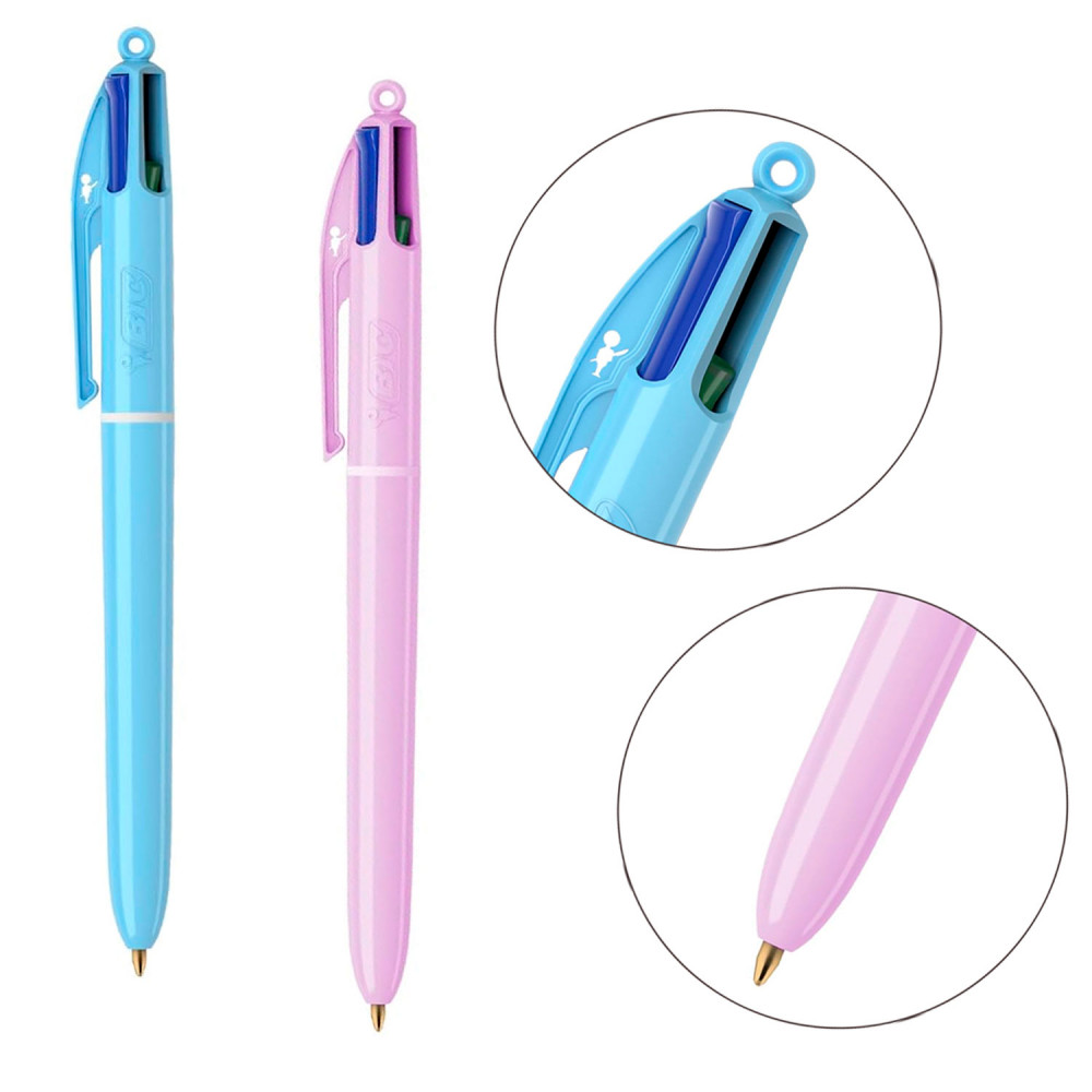 El Bic de 4 colores con clip lateral y 4 puntas de escritura de Ø1 mm en tintas azul, negra, roja y verde. Exterior fabricado en plástico en colores pastel. Modelos opcionales.