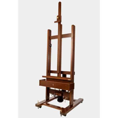 Caballete con motor eléctrico de 220V fabricado en madera de haya con acabado en barniz nogal. Indicado para obras de gran formato y peso. Gracias a su motor eléctrico no nos supondrá ningún esfuerzo adaptarlo a nuestras necesidades.