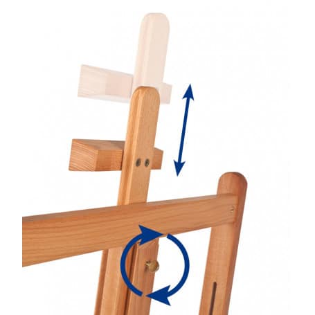 Caballete construido en madera de haya y acabado aceitado en tono natural. Se puede transformar en mesa debido a que permite la inclinación en cualquier posición entre horizontal y vertical. Esta característica lo hace ideal para trabajar con acuarela.
