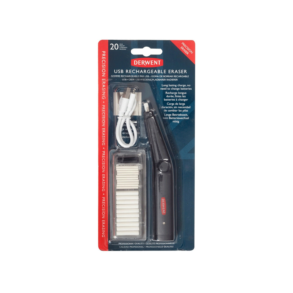 Goma de borrar recargable con conector usb , incluye cable de carga y 20 recambios de goma profesional y no abrasiva Derwent. Es ideal para borrar con precisión