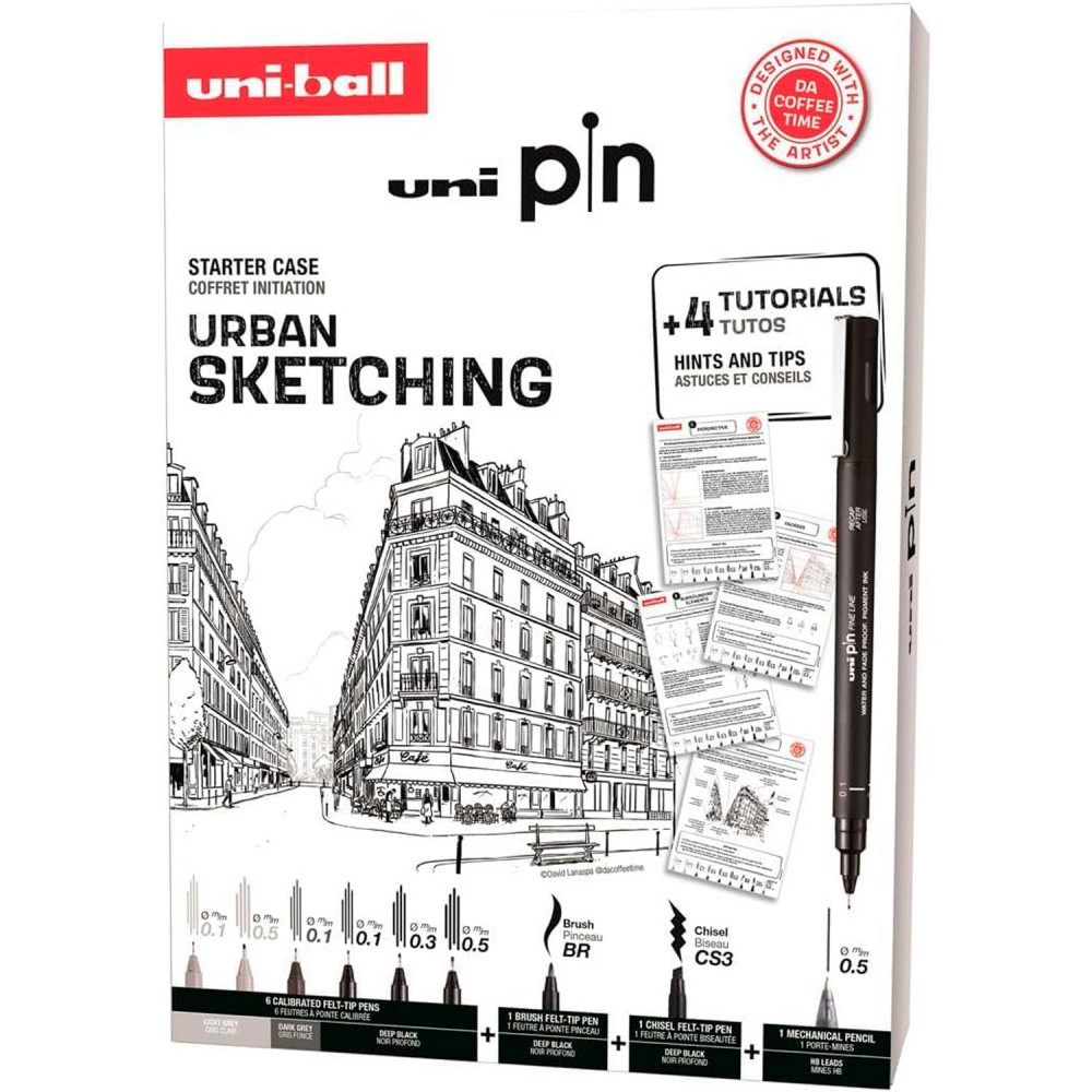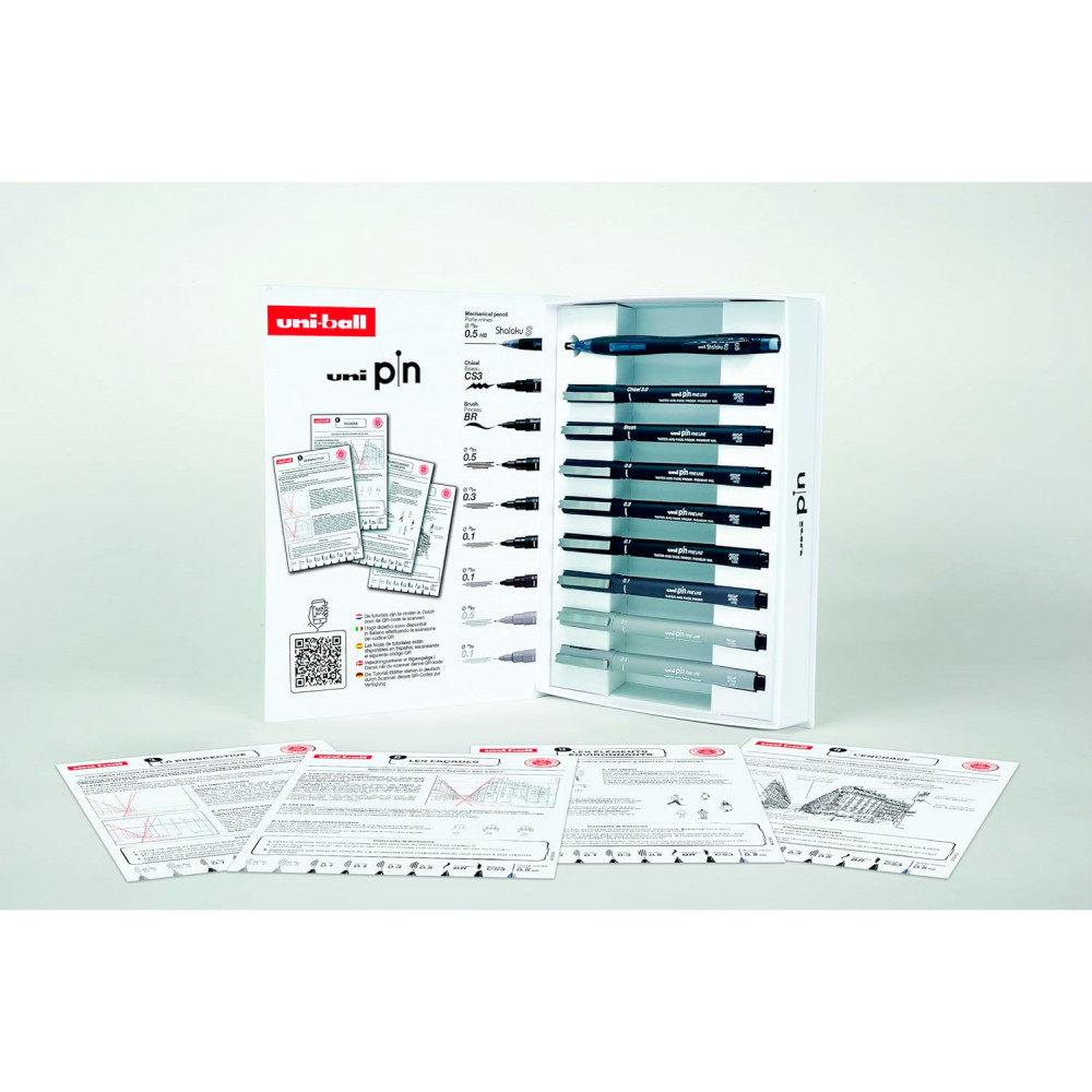 Set de iniciación al diseño tipográfico con una selección de 8 rotuladores Uni Pin en diferentes grosores, puntas de pincel y tonos negro intenso, gris claro y gris medio; un portaminas Shalaku S y 4 tutoriales con consejos.