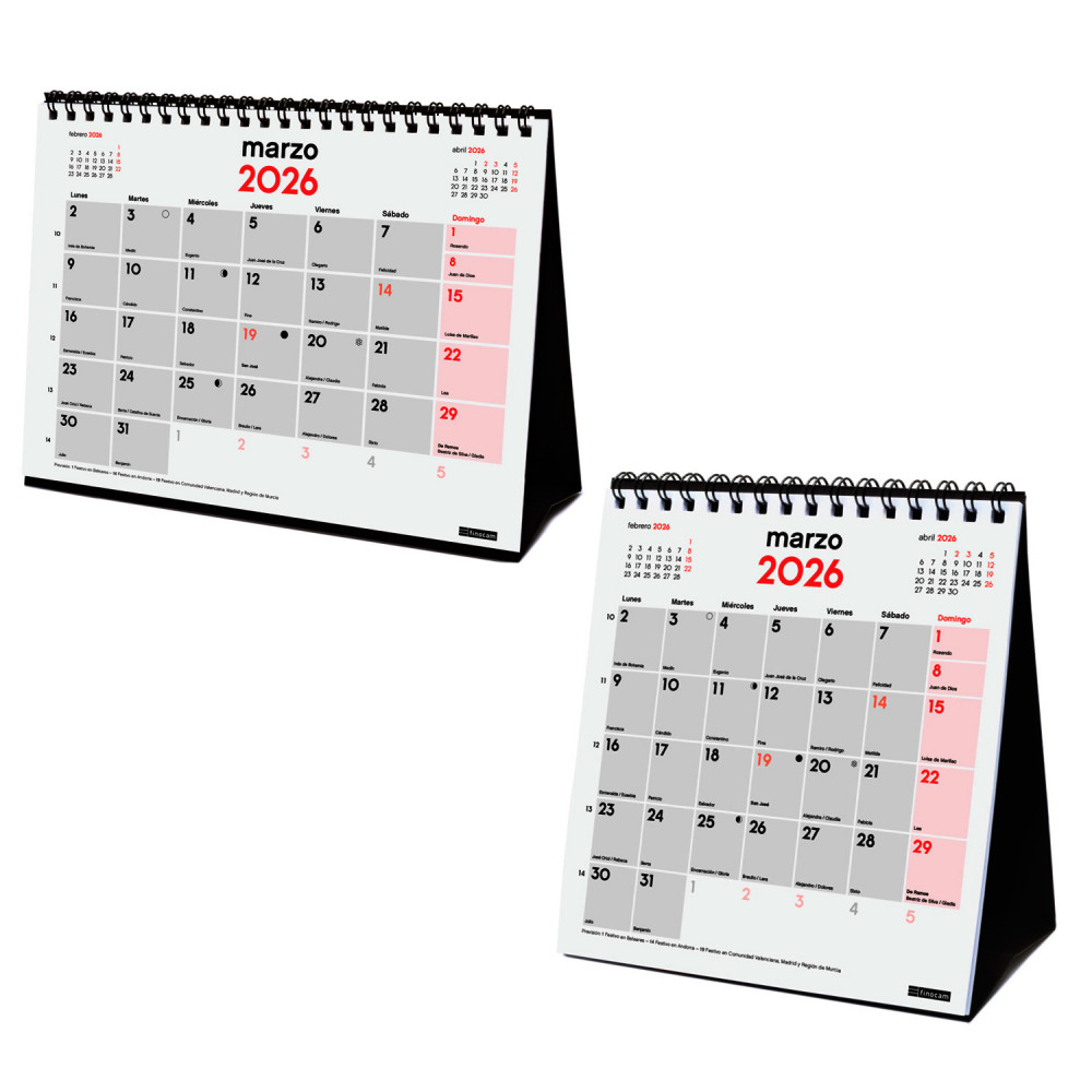 Calendario anual para sobremesa. Cada página contiene el mes en curso con espacio diario para planificar y hacer anotaciones, el mes anterior y el posterior. Encuadernado con doble espiral.