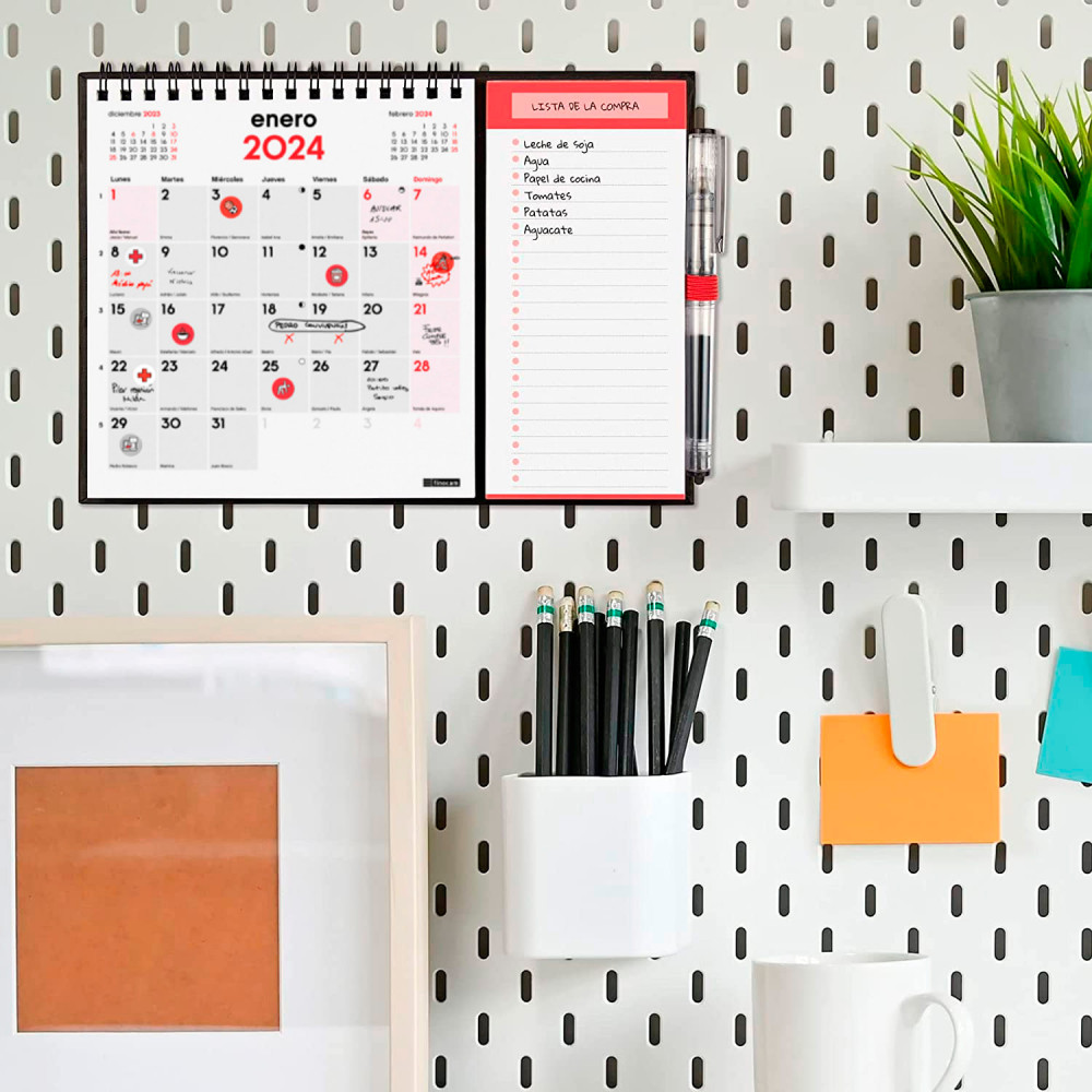 Con espacio diario para notas, doble espiral e imanes para colocarlo en superfícies metálicas, bloc de papel, anilla para boli y set de adhesivos temáticos.
