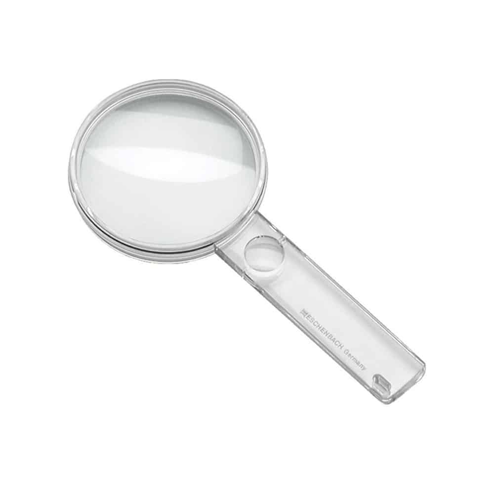 Lupa de gran calidad con lente adicional planoconvexa con 5 aumentos integrada en el mango.