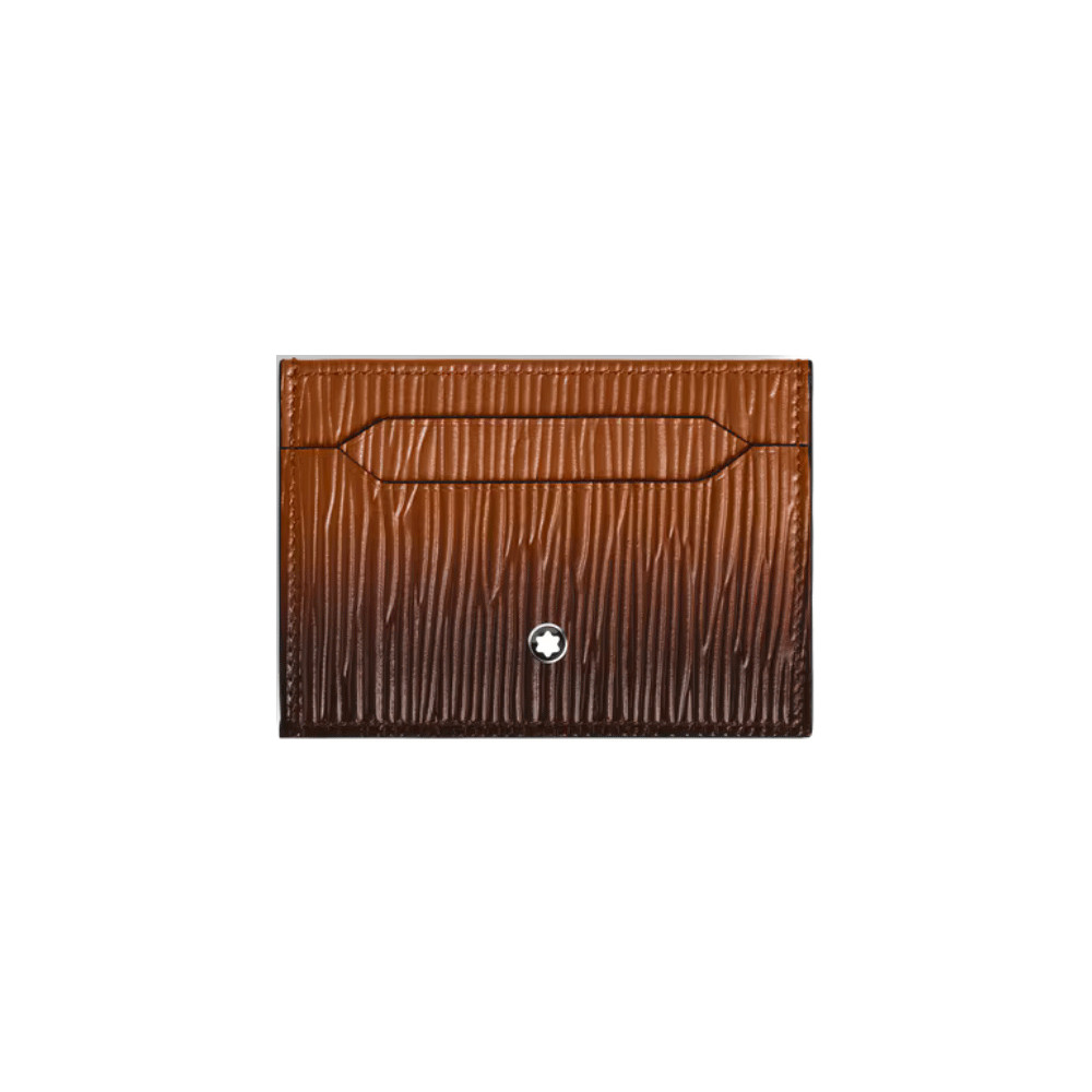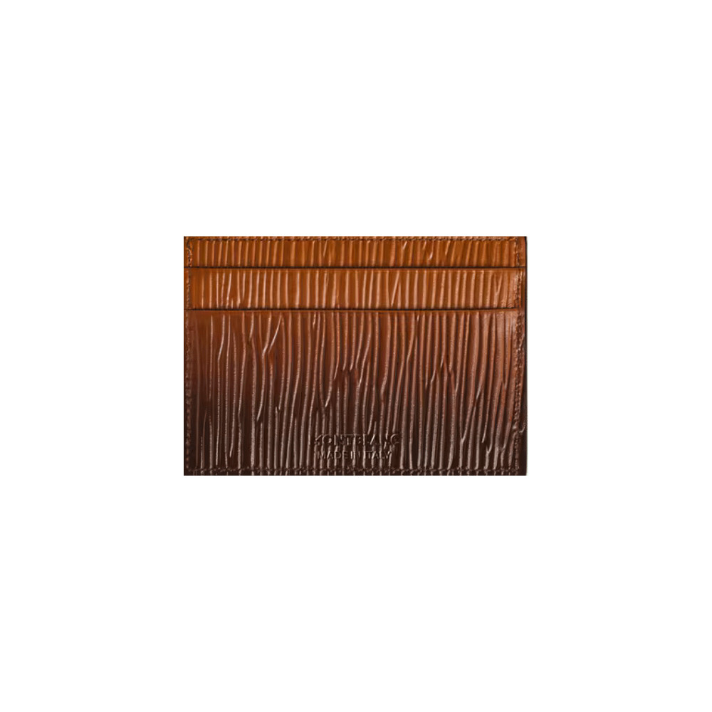 Tarjetero 5 tarjetas en piel en color Leonado con efecto sfumato aplicado a mano y estampado de corteza de árbol, aporta un toque de estilo a los esenciales diario. Parte delantera con emblema Montblanc