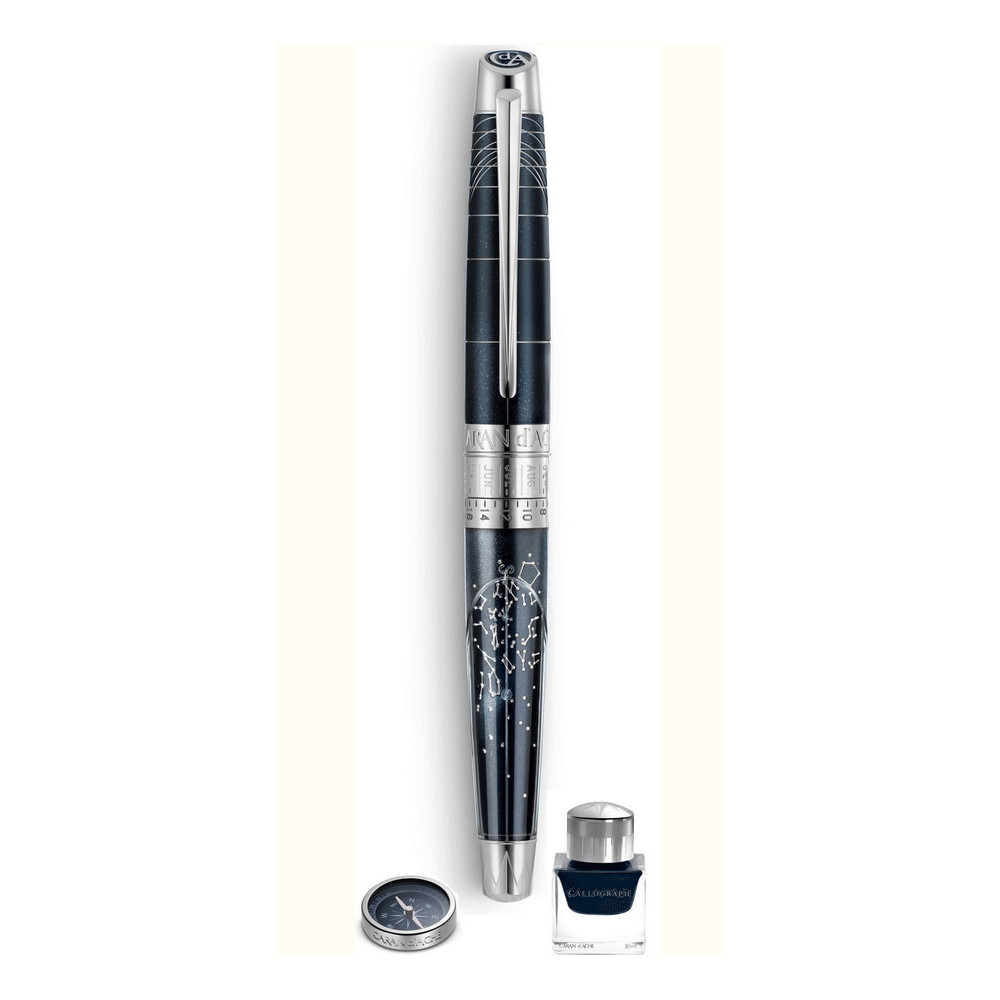 La pluma Caelograph representa las 51 constelaciones y 353 estrellas, observables desde el hemisferio norte gracias a sus dos anillos de plata hora, mes y día. Al ajustar su ubicación, el mapa se coloca en la hora y la fecha solicitadas. Al ajustar su ubicación el mapa se coloca sucesivamente en la hora y la fecha solicitadas. La funda semitransparente revela la parte visible del cielo