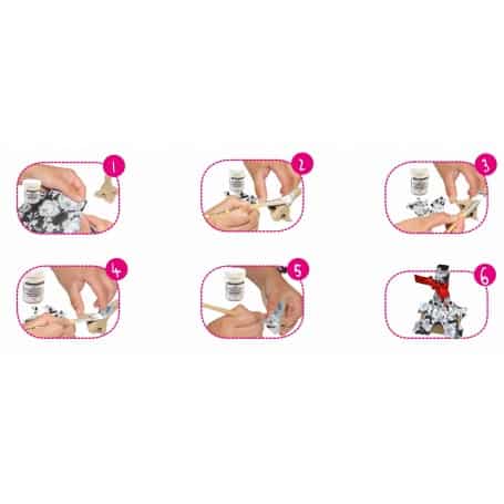 - Adherible sobre cualquier tipo de material: papel maché, cartón, porexpan, plástico, madera, metal, vidrio... incluso sobre textiles