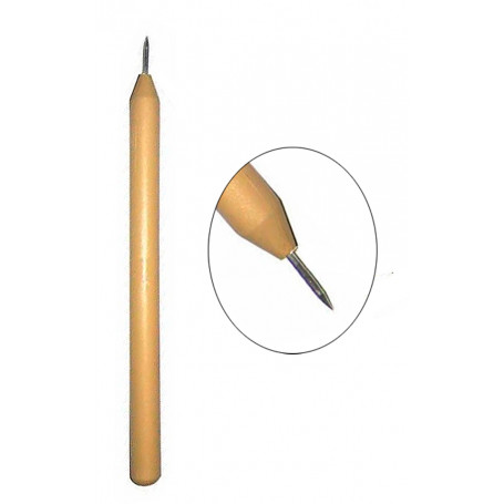 Herramienta que da nombre a la técnica de la punta seca. Se trata de una aguja de acero correctamente afilada con la que se incide sobre planchas de metal o plástico rayándolo para crear una imagen que posteriormente será entintada y estampada.Según el grado de presión que ejercemos, levantamos más o menos metal y esto influye en la intensidad y en el grosor de la linea estampada.