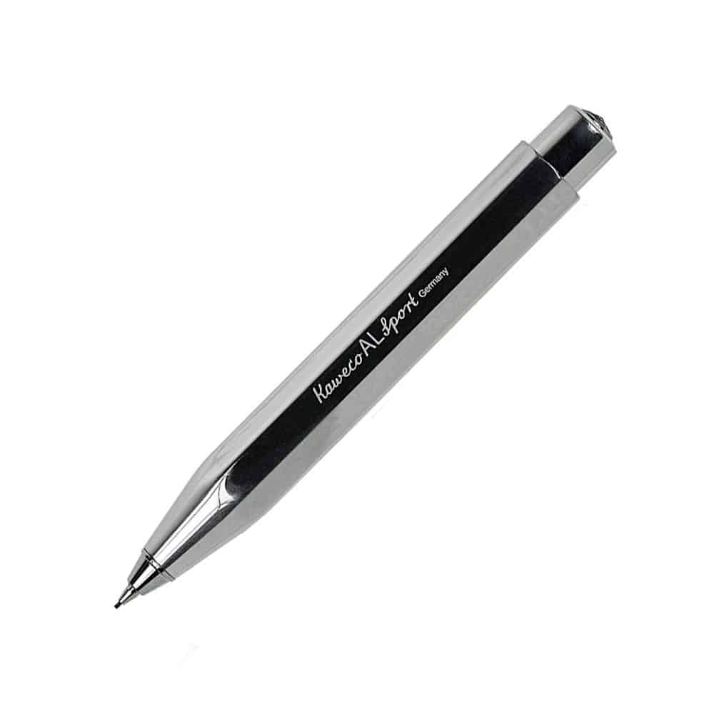 Lápiz de bolsillo con punta metálica para minas de 0,7 mm. y mecanismo de pulsado. Piezas de aluminio de alta calidad pulidas a mano. Uso opcional con o sin clip.