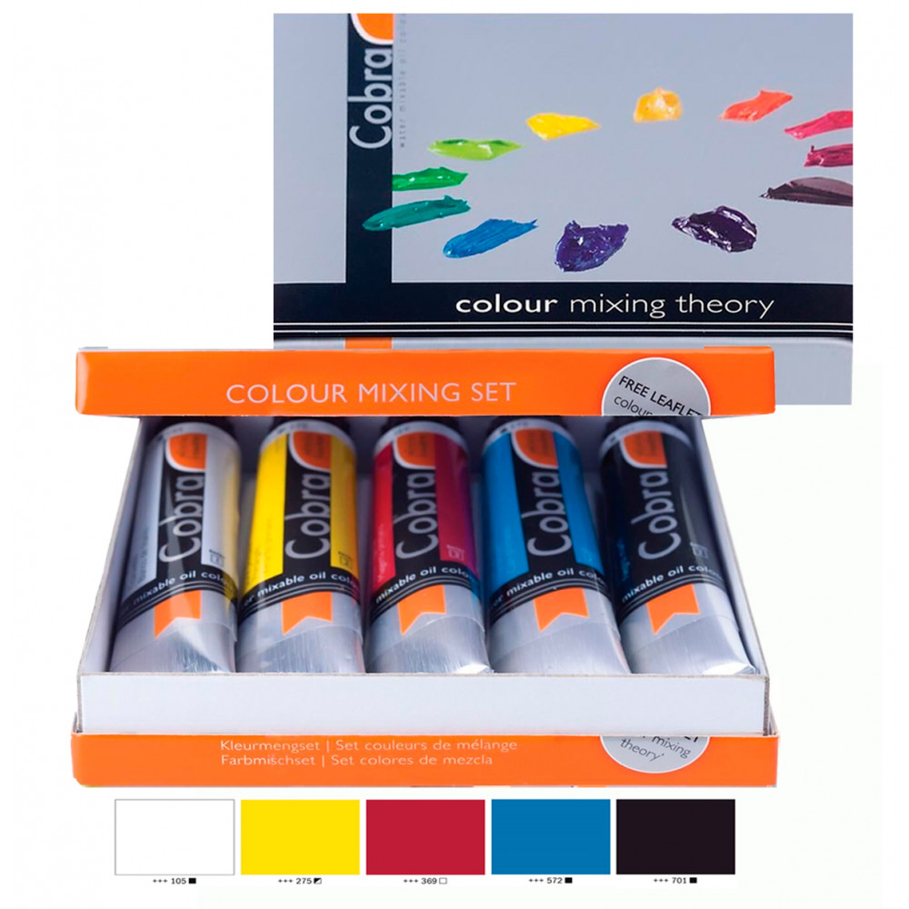 Presentación: Estuche con 5 colores básicos de 20ml (Blanco Titanio, Amarillo Primario, Magenta Primario, Cyan Primario, Negro Marfil) y librillo de teoría explicativa de cómo mezclar los colores.