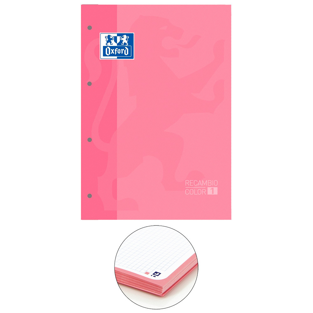 Recambio de hojas con 4 taladros, con borde en color en formato A4+y rayado cuadriculado 5x5. Al estar encolado y llevar tapas puede utilizarse como un cuaderno.