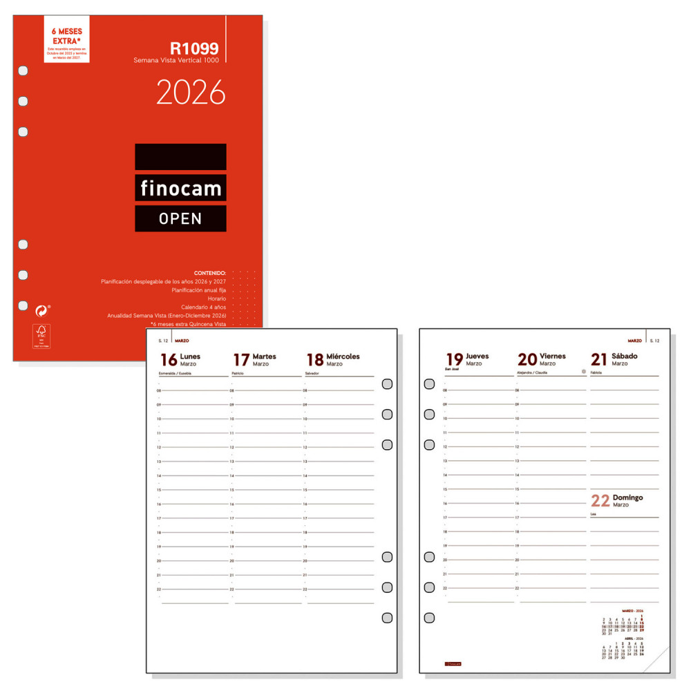 Recambio anual para agendas de anillas Finocam Open. Con plan anual desplegable, planificación anual fija, horario, calendarios, anualidad y 6 meses complementarios quincena vista.