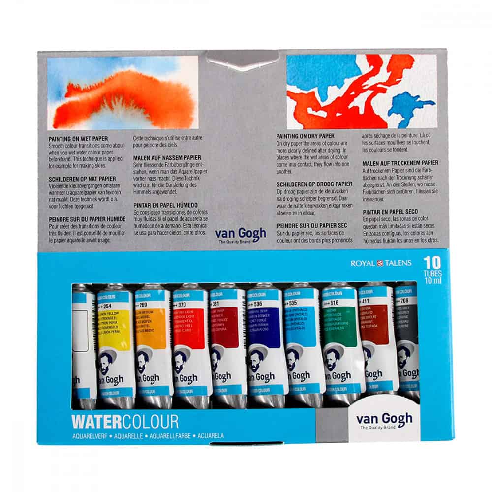 Las acuarelas Van Gogh están clasificadas como gama de pintura nivel estudiante yartista. Ofrecen colores brillantes, transparentes e intensos con un gran poder colorante. Gracias a su pureza y su viscosidad uniforme, es fácil de mezclar estas acuarelas y trabaja con ellas