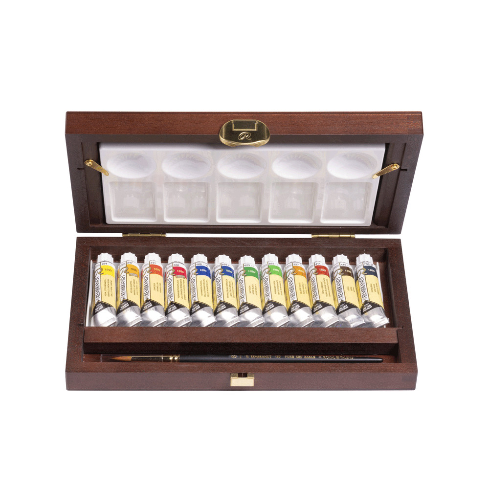 Caja de madera de acuarelas profesionales elaboradas con pigmentos puros y goma aràbiga de alta calidad. Tienen gran transpariencia y gran resistencia a la luz para los artistas mas exigentes