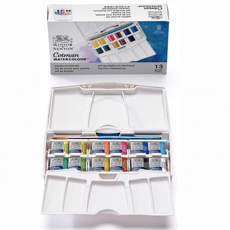 Estuche compacto con paleta de mezclas. Contiene 12 colores de acuarela Cotman en medias pastillas y un pincel de bolsillo. Ideal para viajes y pintura de campo.