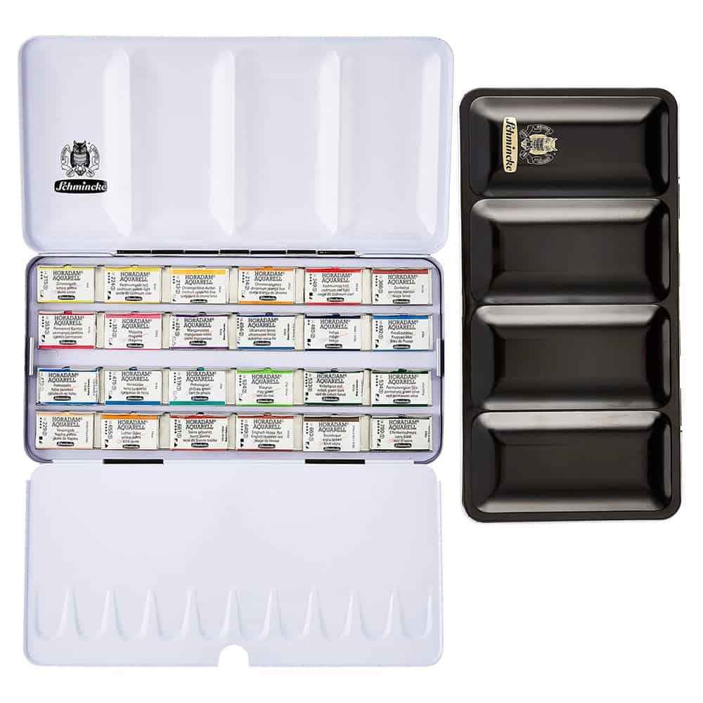 Caja de acuarelas Schmincke Horadam de 24 colores profesionales. Pigmentos intensos y luminosos, excelente rehumectación y calidad alemana. Perfecta para artistas que buscan precisión, creatividad y obras llenas de vida y emoción.