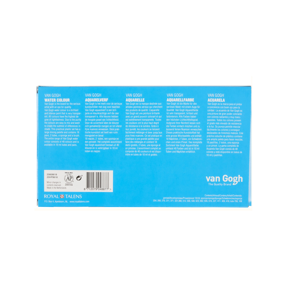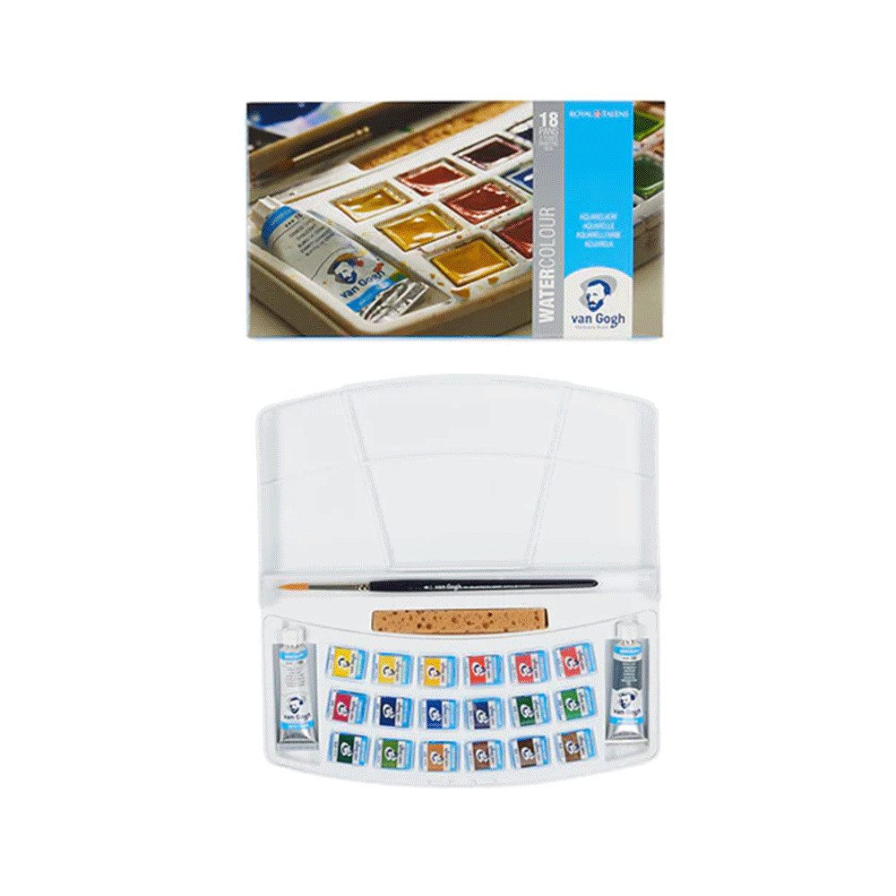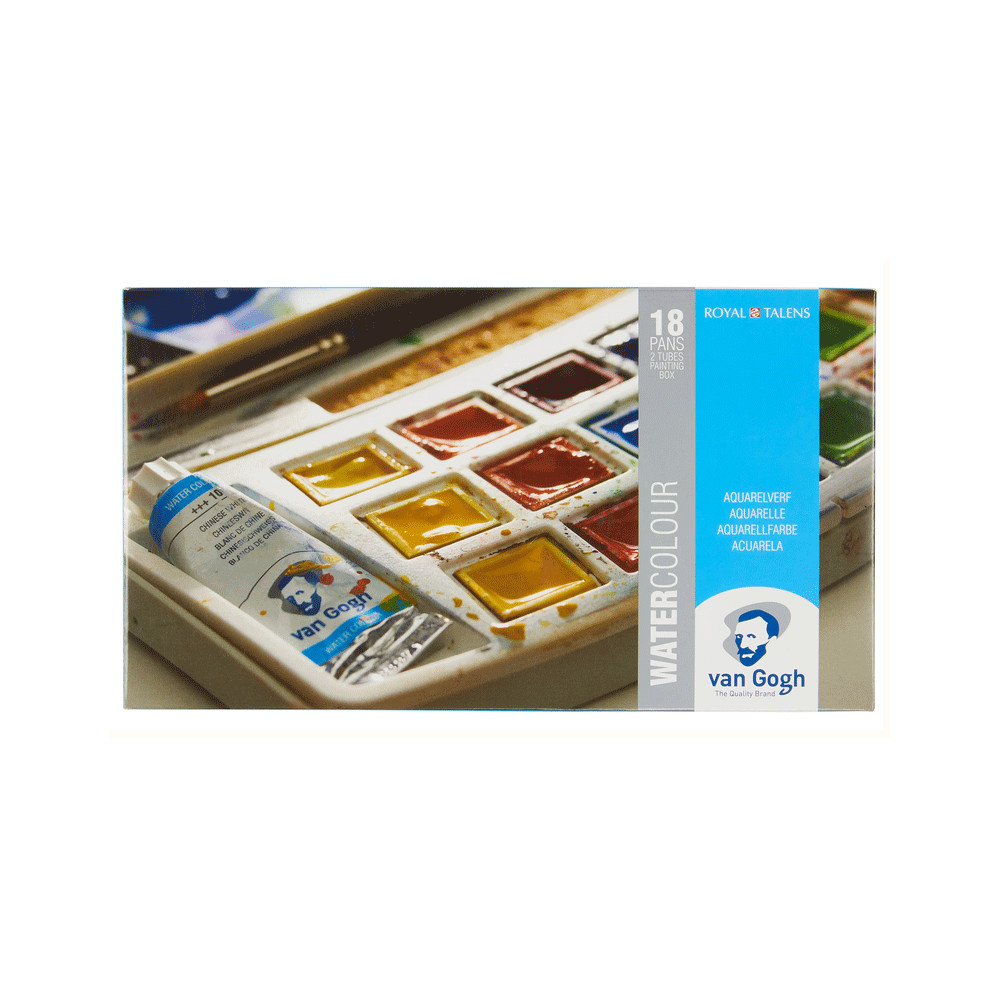 Descubre la caja de acuarelas Van Gogh 18 pastillas de color vibrante, 2 tubos de 10 ml, pincel y esponja. Una selección equilibrada, fácil de usar y con gran luminosidad, perfecta para disfrutar y crear con acuarela. Gran resistencia a la luz y pureza y viscosidad uniforme